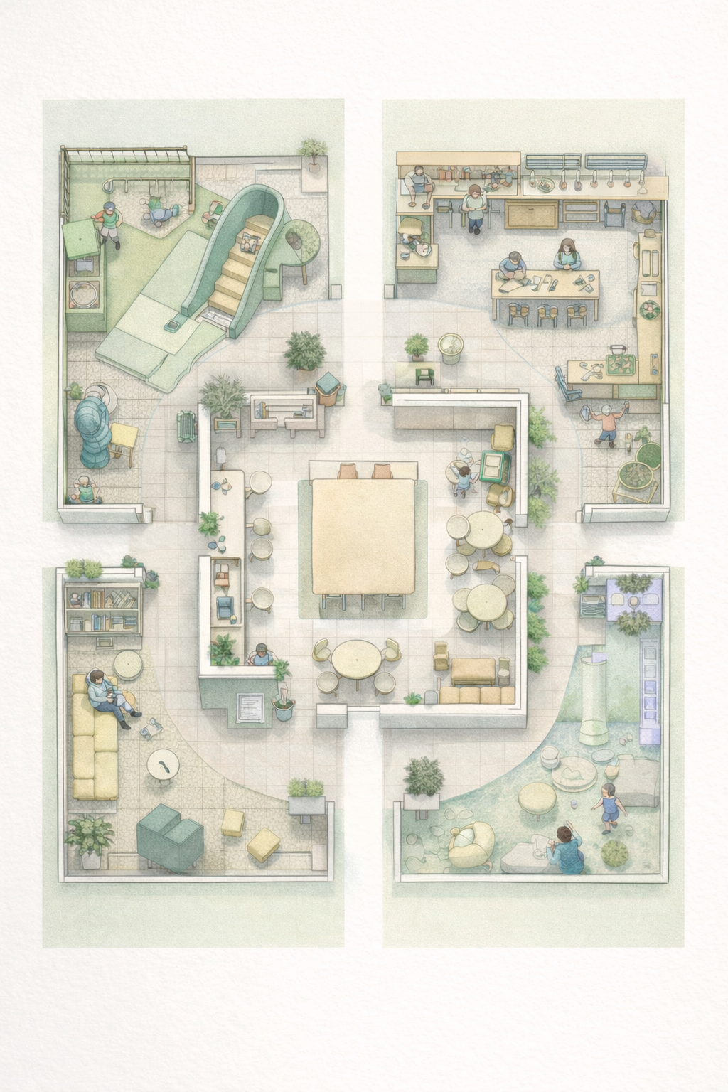 Spaces for various types of play-tinker, climb/jump, read, splash, etc